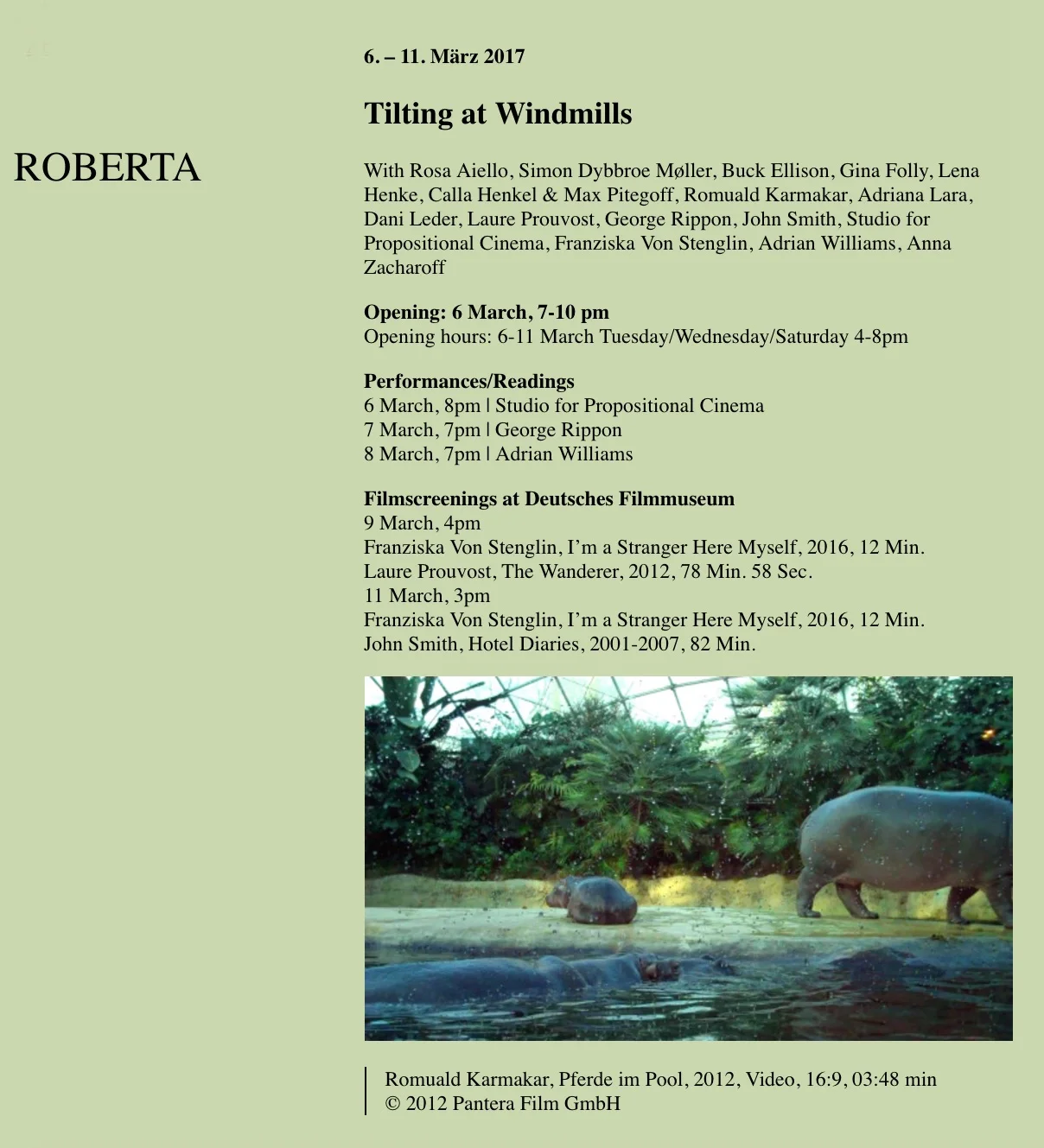 Roberta is a project space set in a private apartment. In all previous exhibitions, there was an attempt to disguise the specific features of a private home in order to create the illusion of a neutral presentational space. However, for "Tilting at Windmills", the private rooms with their characteristic features become the setting, reorganized by Adriana Lara for installations by other artists invited.